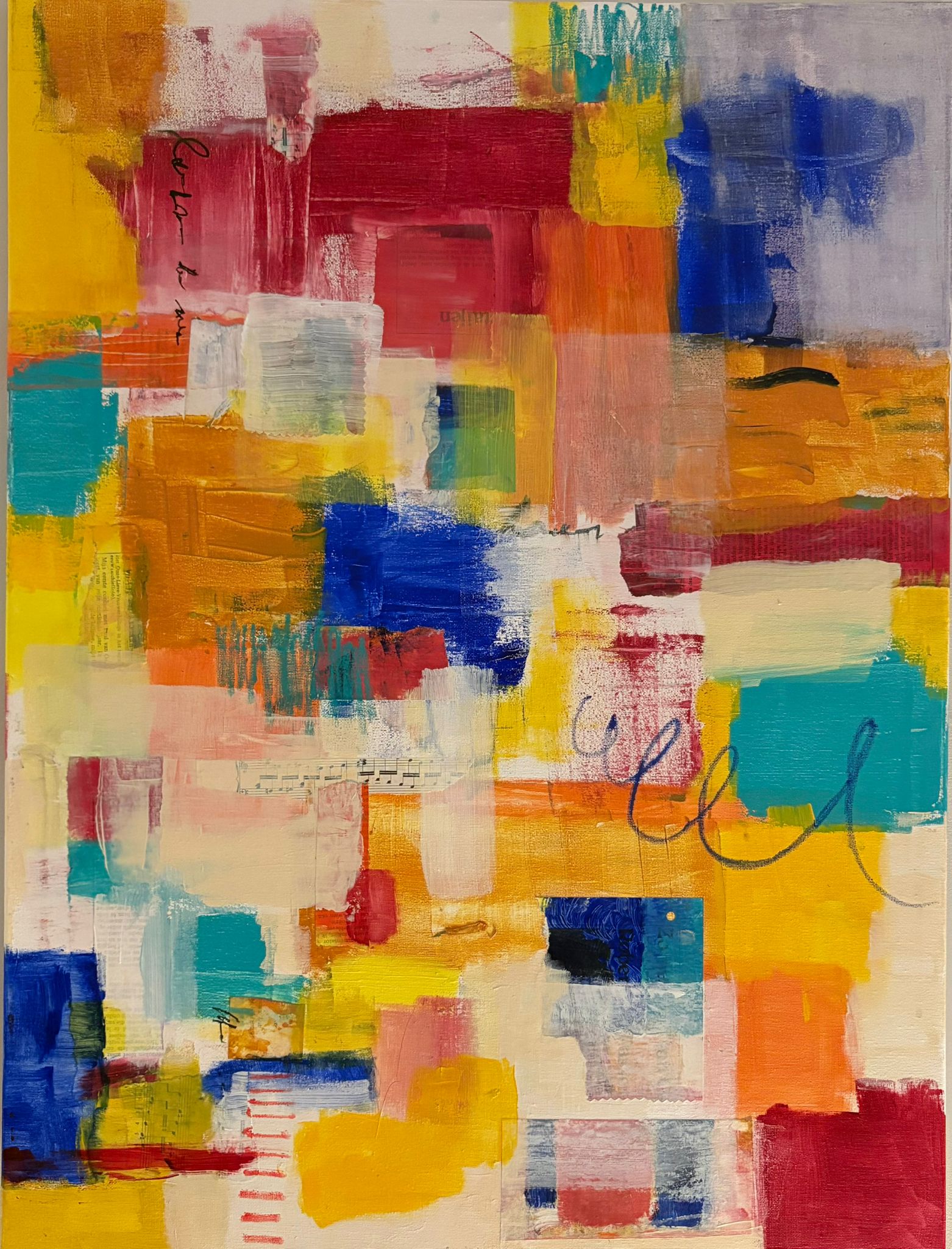 Scraps of Happiness, paper and acrylic paint on canvas, explores the joy of stitching together memories.