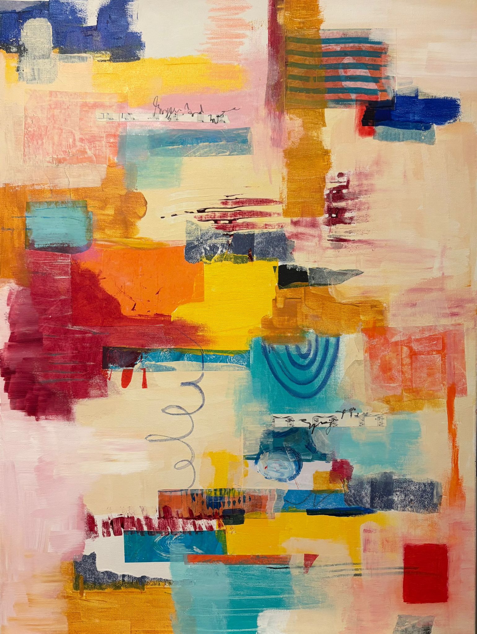 Sunburst Patch, paper and acrylic paint on canvas, 58 x77 cm, explores the joy of a sunlit patch, shining trhough.